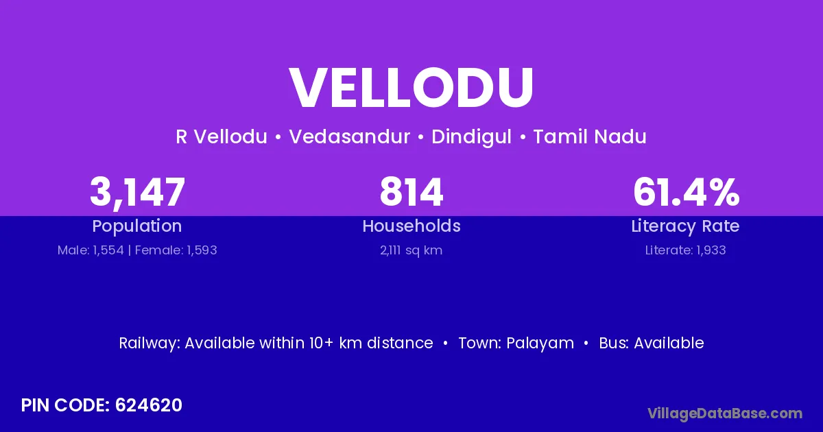 Vellodu village has a total population of 3,147 people, of which 1,554 are males and 1,593 are females.