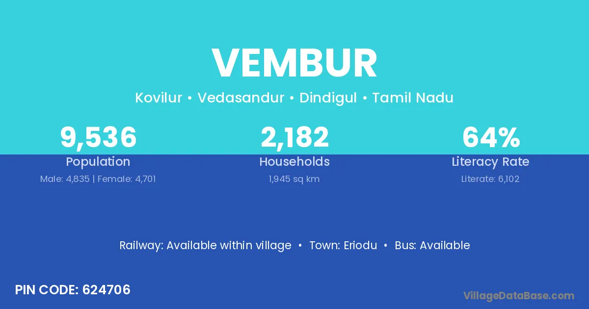 Vembur village has a total population of 9,536 people, of which 4,835 are males and 4,701 are females.