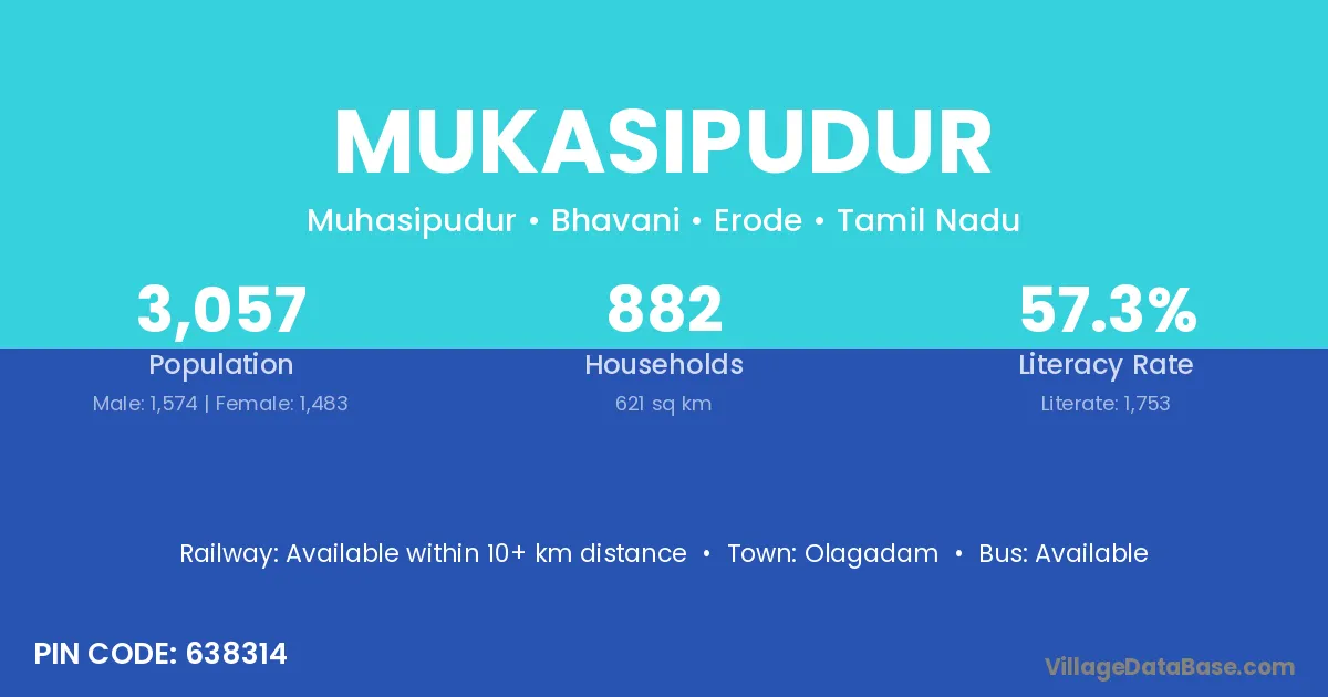 Mukasipudur village has a total population of 3,057 people, of which 1,574 are males and 1,483 are females.