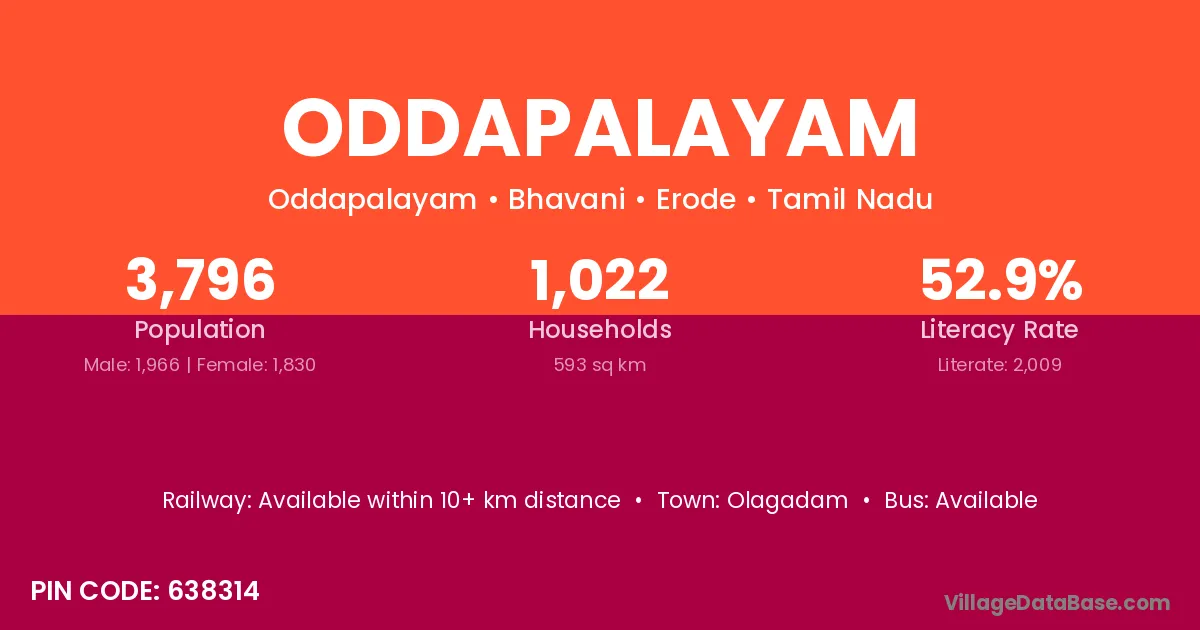 Oddapalayam village has a total population of 3,796 people, of which 1,966 are males and 1,830 are females.
