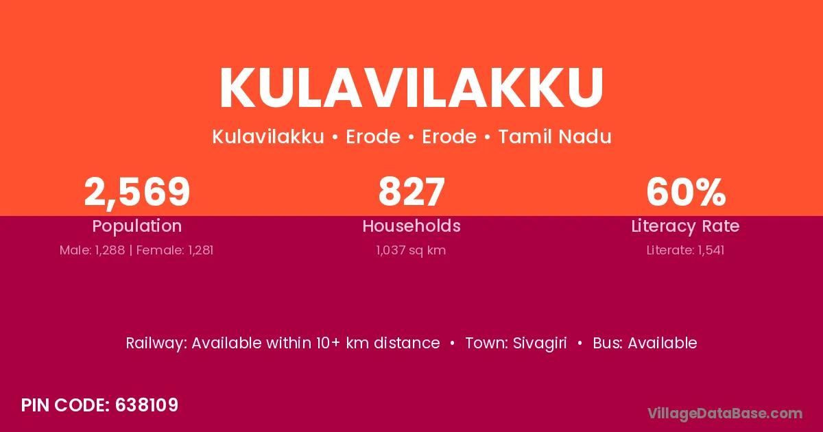 Kulavilakku village has a total population of 2,569 people, of which 1,288 are males and 1,281 are females.