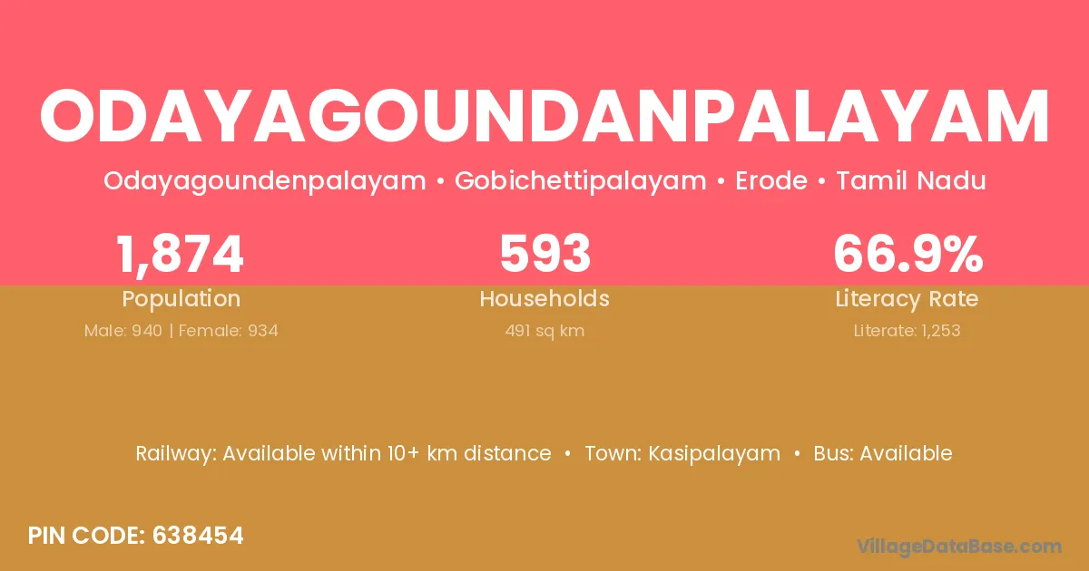 Odayagoundanpalayam village has a total population of 1,874 people, of which 940 are males and 934 are females.