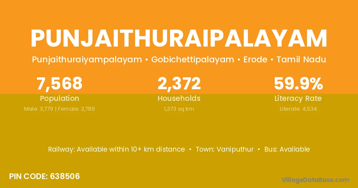 Punjaithuraipalayam village has a total population of 7,568 people, of which 3,779 are males and 3,789 are females.