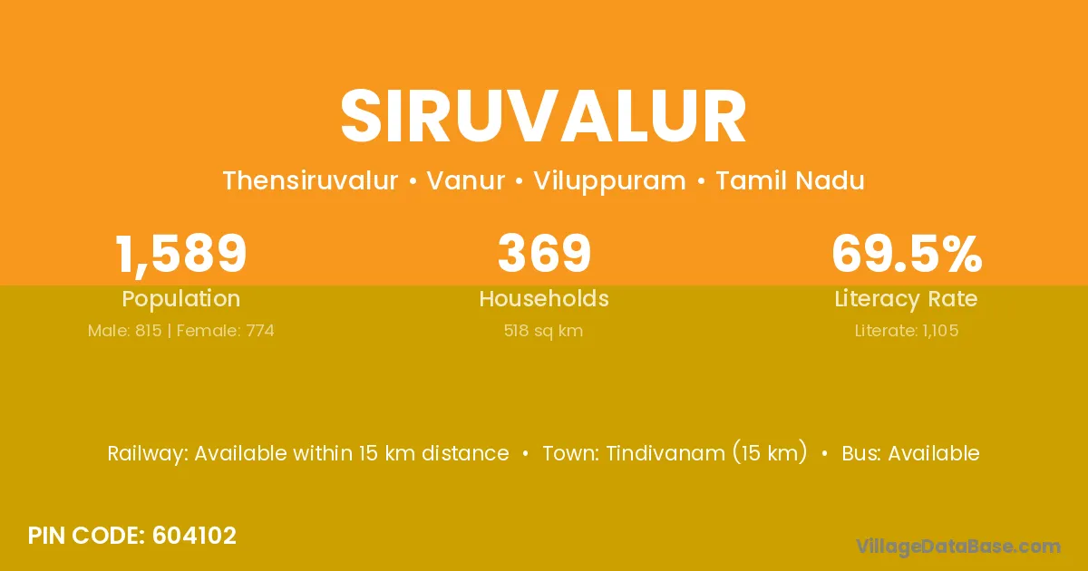 Siruvalur village has a total population of 7,923 people, of which 3,982 are males and 3,941 are females.