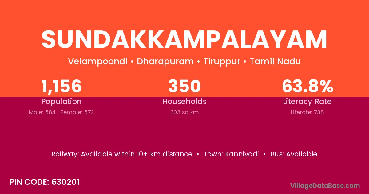 The literacy rate of Sundakkampalayam village is 56.31%. Male literacy stands at 65.28% and female literacy at 47.81%.