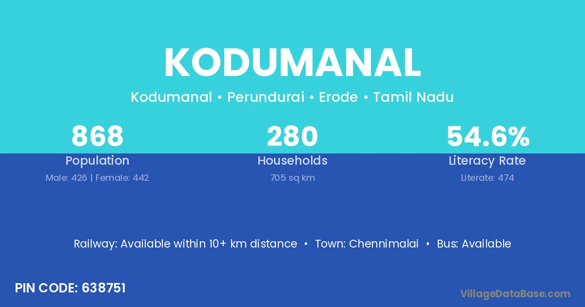 Kodumanal village has a total population of 868 people, of which 426 are males and 442 are females.