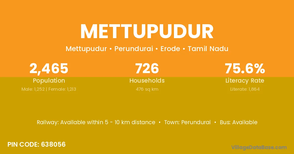 According to Census 2011 information, the village code of Mettupudur village is 638056.