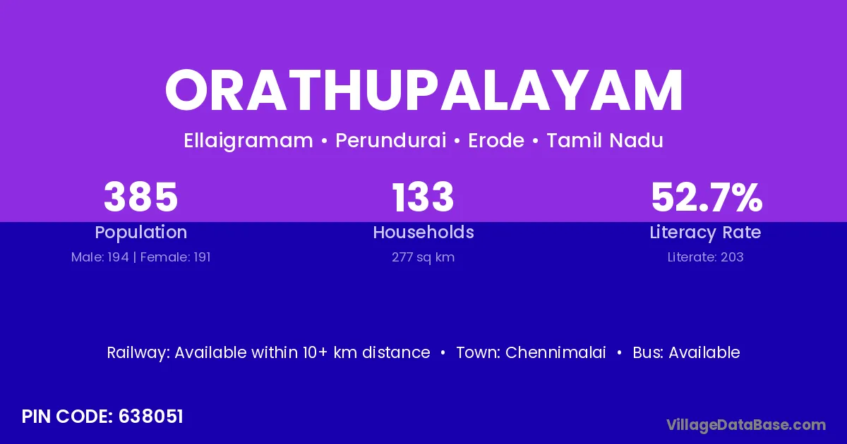 Orathupalayam village has a total population of 385 people, of which 194 are males and 191 are females.