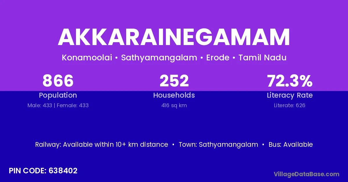 Sathyamangalam is the nearest town to Akkarainegamam village for major economic activities