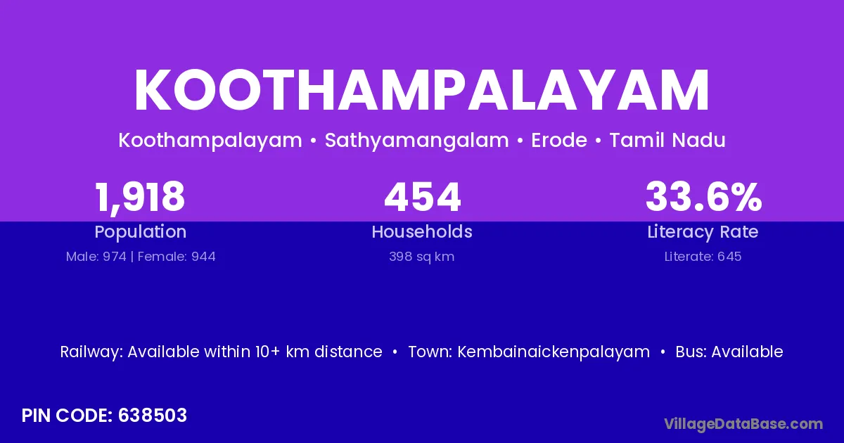 Koothampalayam village has a total population of 1,918 people, of which 974 are males and 944 are females.