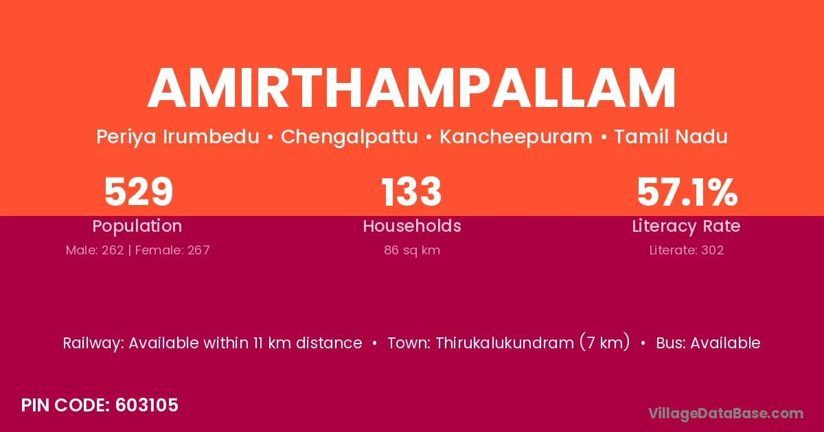Amirthampallam village has a total population of 529 people, of which 262 are males and 267 are females.