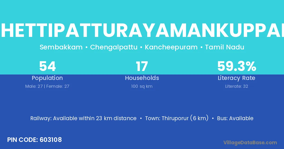 Chettipatturayamankuppam village has a total population of 54 people, of which 27 are males and 27 are females.