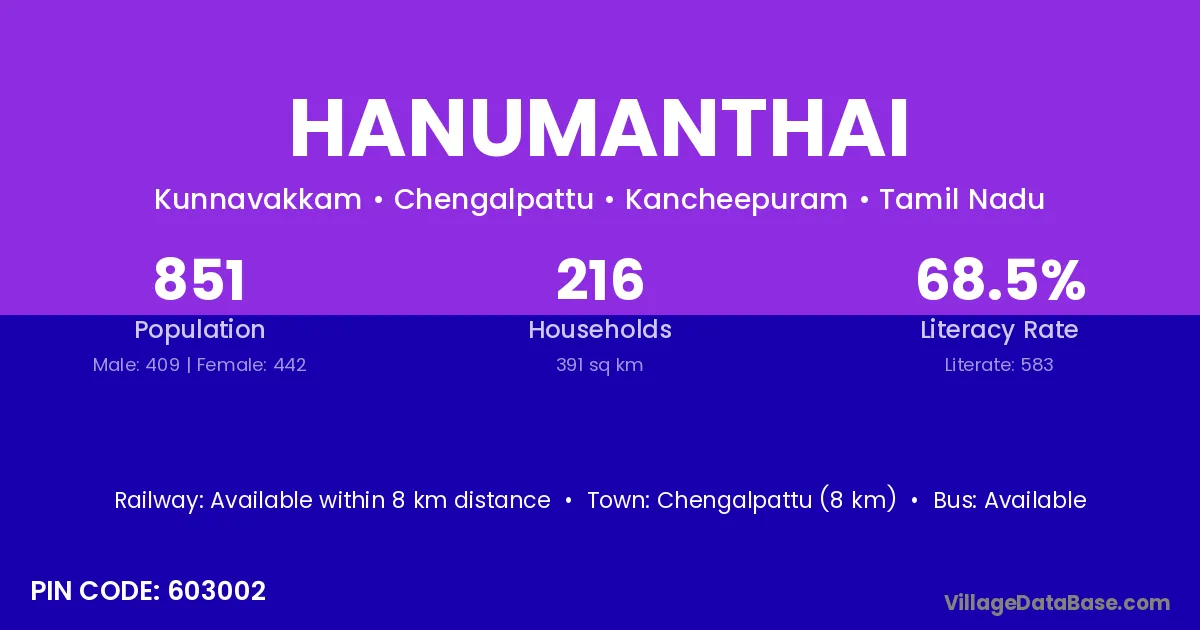 Chengalpattu (8 km) is the nearest town to Hanumanthai village for major economic activities and is located approximately 8 km away.