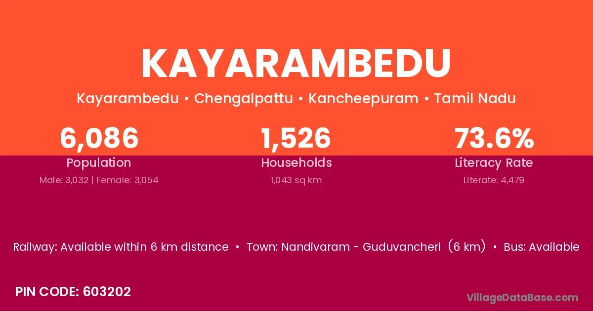 Kayarambedu village has a total population of 6,086 people, of which 3,032 are males and 3,054 are females.