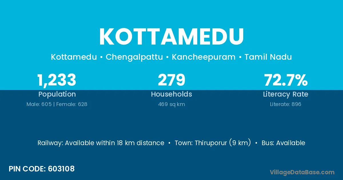 Thiruporur (9 km) is the nearest town to Kottamedu village for major economic activities and is located approximately 9 km away.