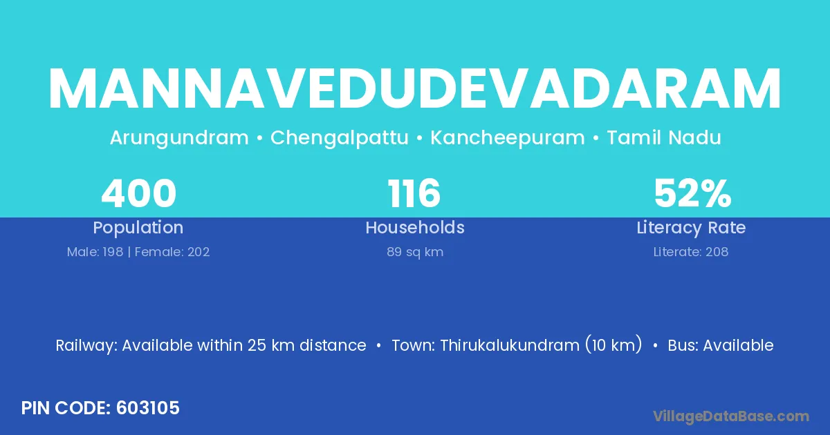Mannavedudevadaram village has a total population of 400 people, of which 198 are males and 202 are females.