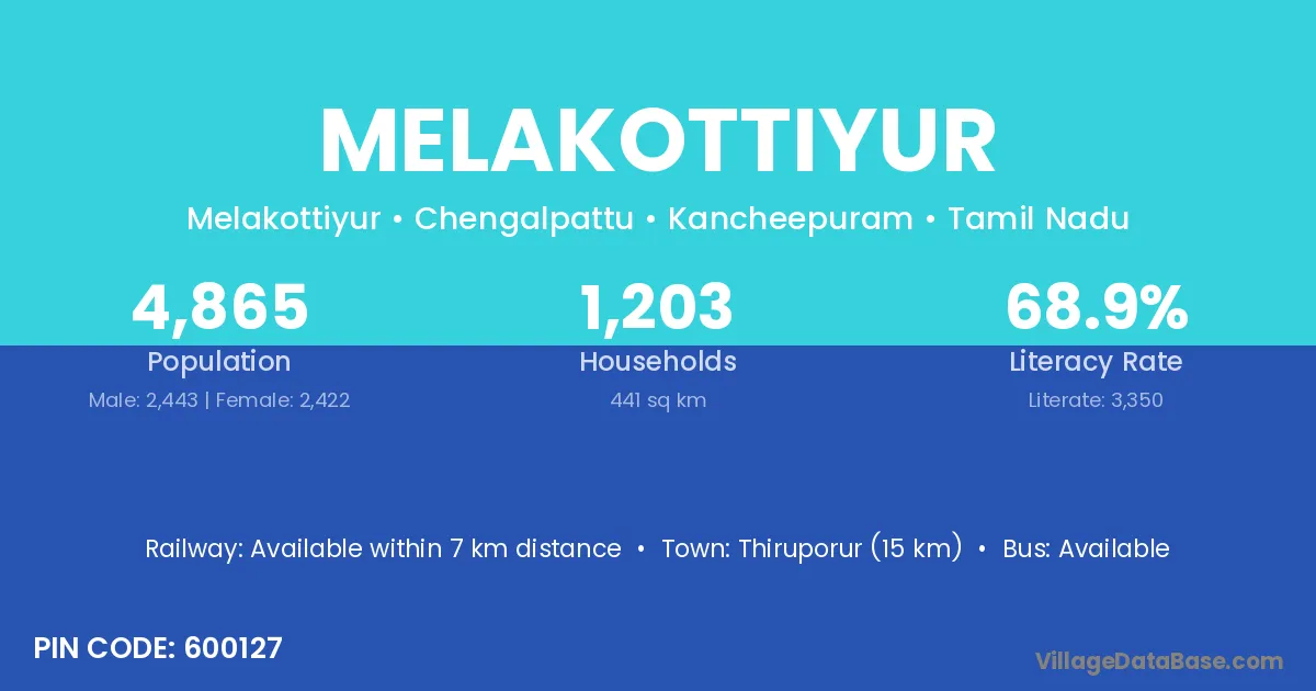 Thiruporur (15 km) is the nearest town to Melakottiyur village for major economic activities and is located approximately 15 km away.