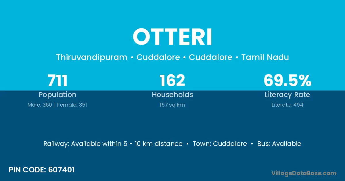 The literacy rate of Otteri village is 70.38%. Male literacy stands at 76.87% and female literacy at 63.57%.