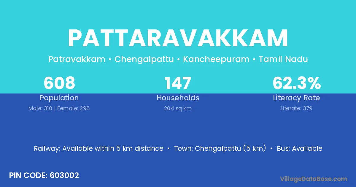 Pattaravakkam village has a total population of 608 people, of which 310 are males and 298 are females.
