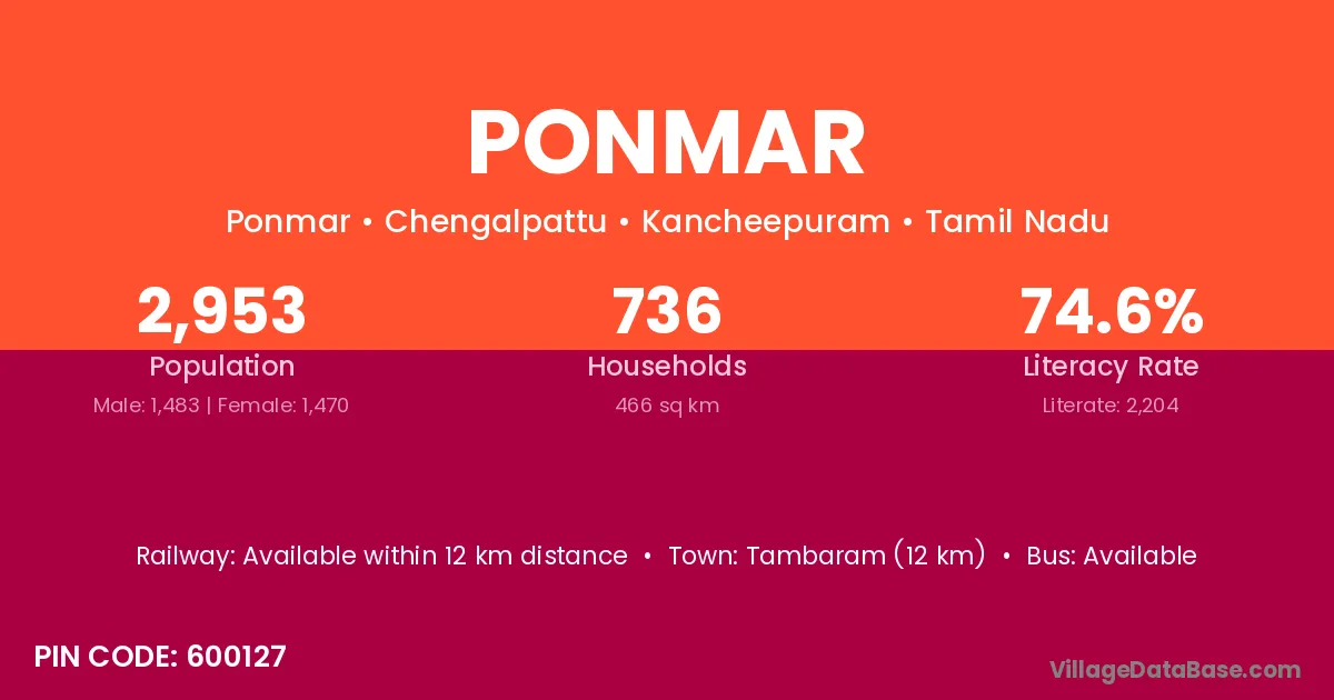 Tambaram (12 km) is the nearest town to Ponmar village for major economic activities and is located approximately 12 km away.