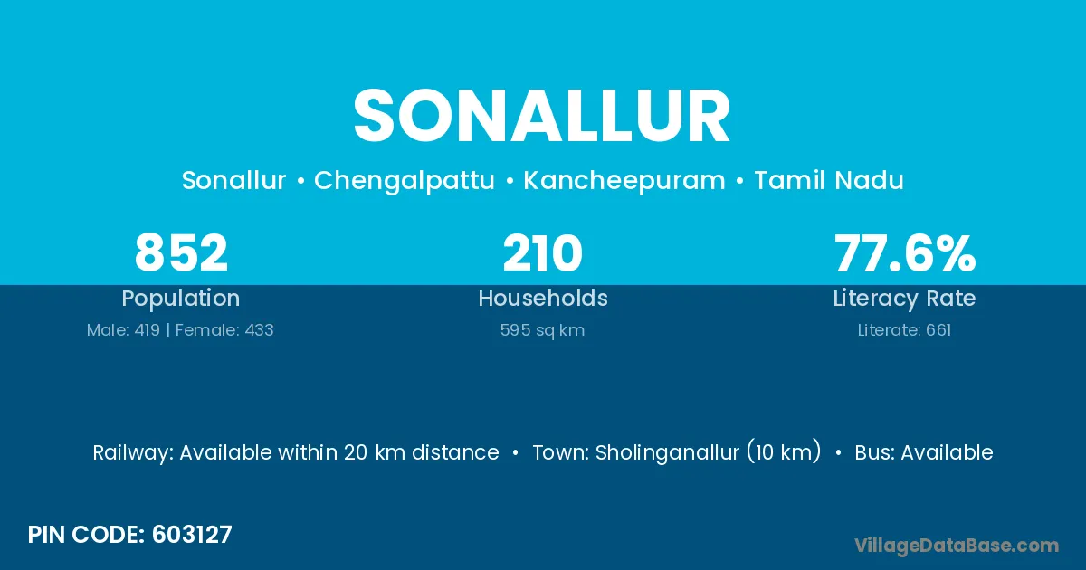 Sholinganallur (10 km) is the nearest town to Sonallur village for major economic activities and is located approximately 10 km away.