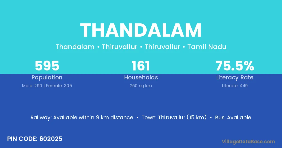 Thiruporur (1 km) is the nearest town to Thandalam village for major economic activities and is located approximately 1 km away.