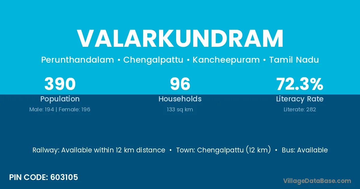 Chengalpattu (12 km) is the nearest town to Valarkundram village for major economic activities and is located approximately 12 km away.