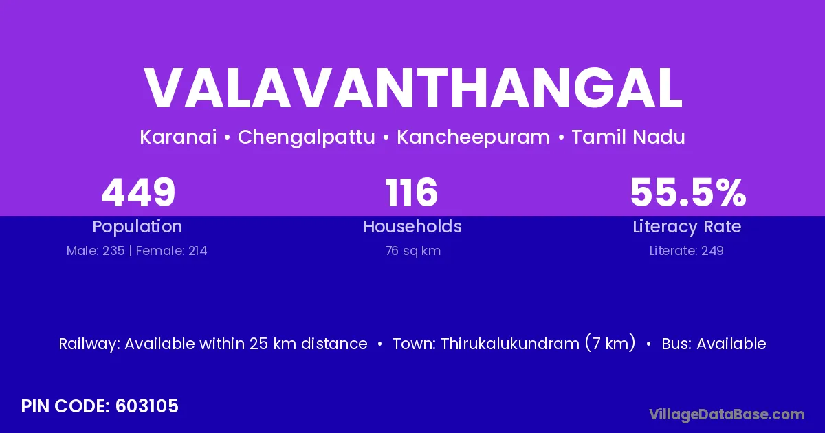 Valavanthangal village has a total population of 449 people, of which 235 are males and 214 are females.