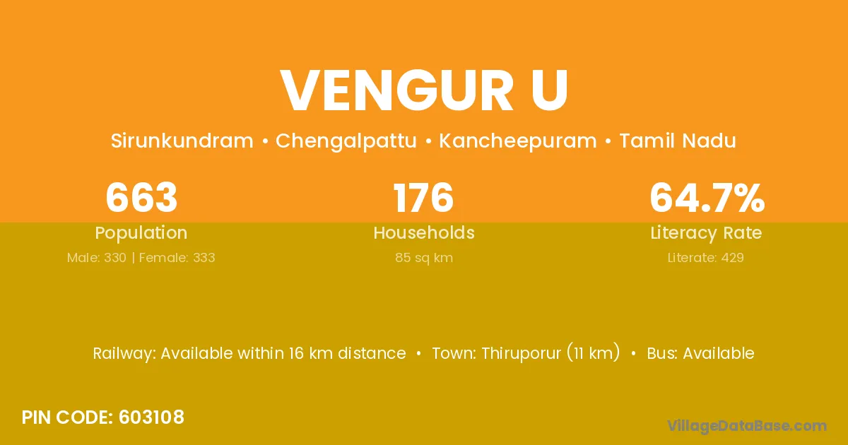 Thiruporur (11 km) is the nearest town to Vengur U village for major economic activities and is located approximately 11 km away.