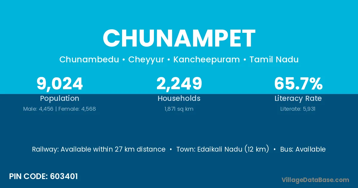 Edaikali Nadu (12 km) is the nearest town to Chunampet village for major economic activities and is located approximately 12 km away.