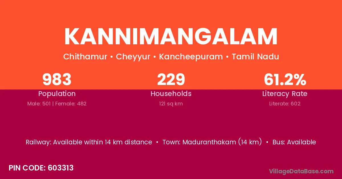 Kannimangalam village has a total population of 983 people, of which 501 are males and 482 are females.