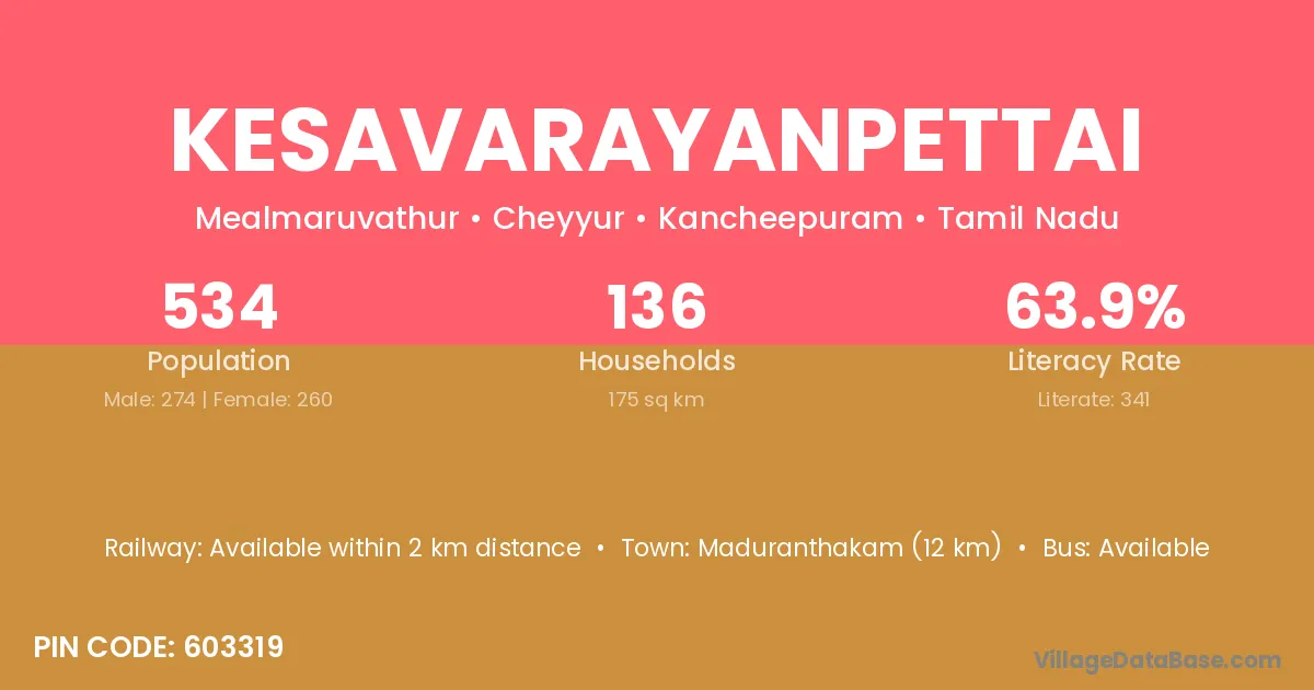 Maduranthakam (12 km) is the nearest town to Kesavarayanpettai village for major economic activities and is located approximately 12 km away.