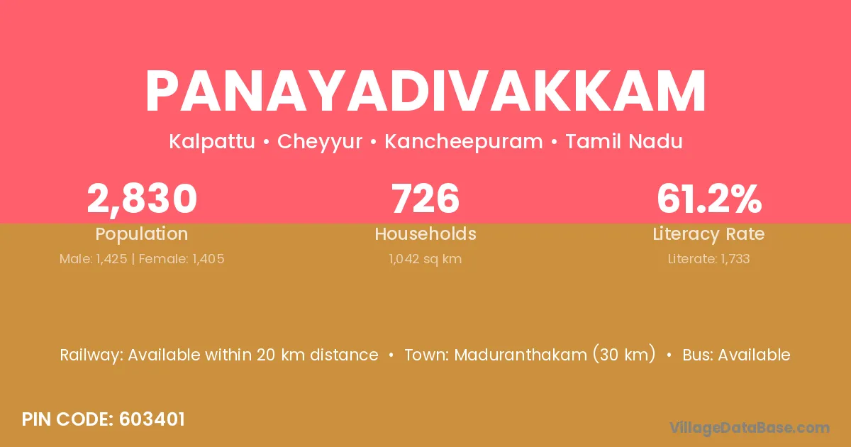 Maduranthakam (30 km) is the nearest town to Panayadivakkam village for major economic activities and is located approximately 30 km away.