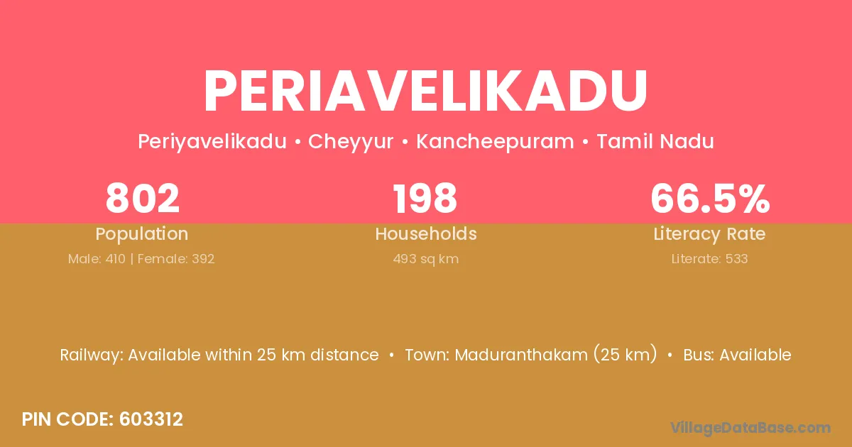 Maduranthakam (25 km) is the nearest town to Periavelikadu village for major economic activities and is located approximately 25 km away.