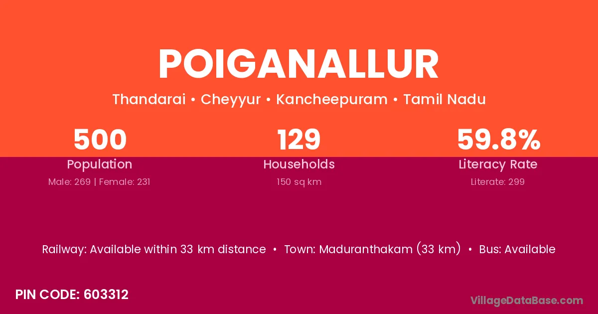 Maduranthakam (33 km) is the nearest town to Poiganallur village for major economic activities and is located approximately 33 km away.