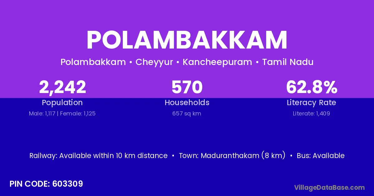 Polambakkam village has a total population of 2,242 people, of which 1,117 are males and 1,125 are females.