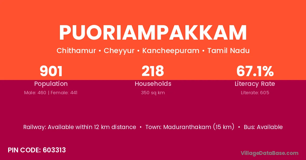 Maduranthakam (15 km) is the nearest town to Puoriampakkam village for major economic activities and is located approximately 15 km away.