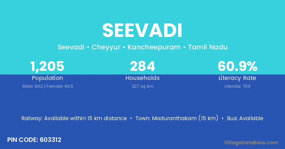 Maduranthakam (15 km) is the nearest town to Seevadi village for major economic activities and is located approximately 15 km away.