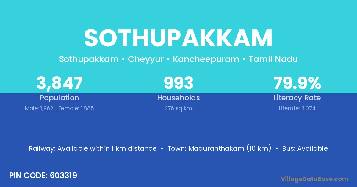 Sothupakkam village has a total population of 3,847 people, of which 1,962 are males and 1,885 are females.