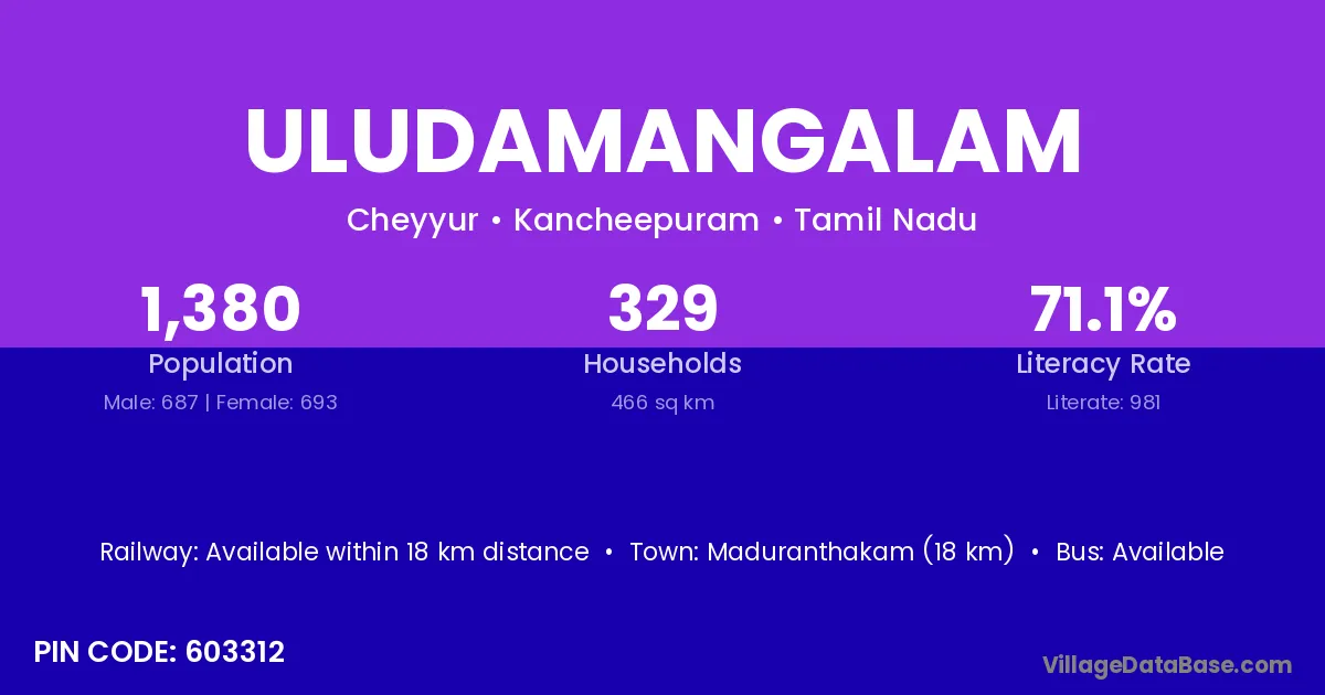 Uludamangalam village has a total population of 1,380 people, of which 687 are males and 693 are females.