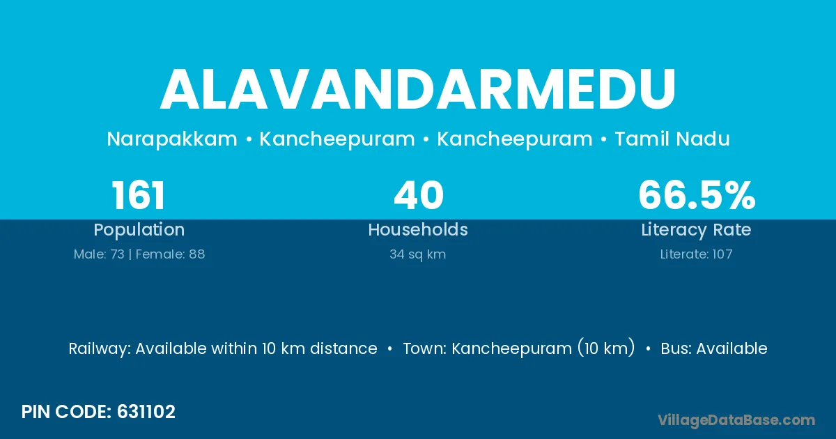 Kancheepuram (10 km) is the nearest town to Alavandarmedu village for major economic activities and is located approximately 10 km away.