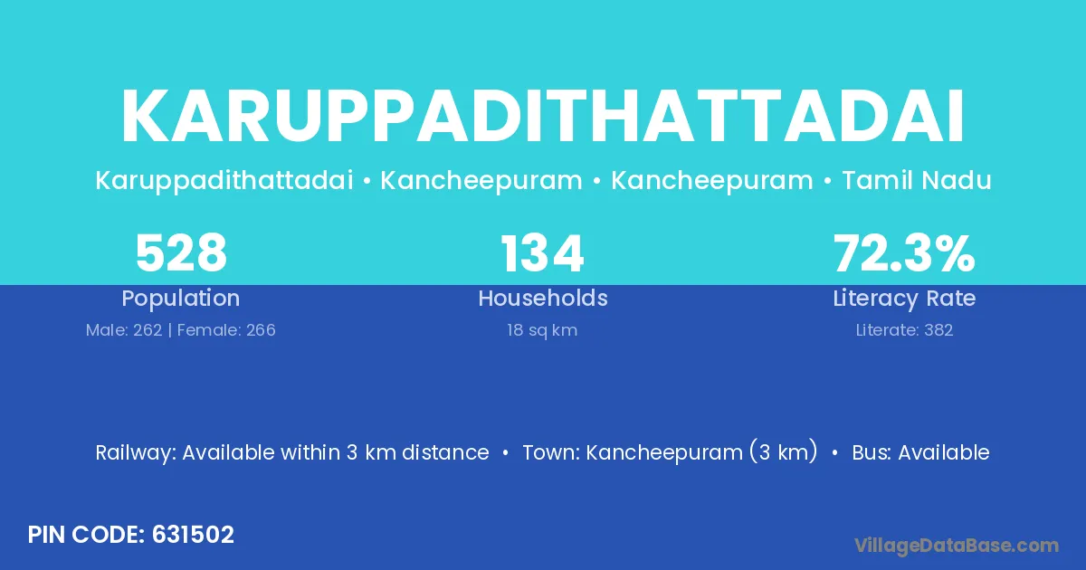 Kancheepuram (3 km) is the nearest town to Karuppadithattadai village for major economic activities and is located approximately 3 km away.