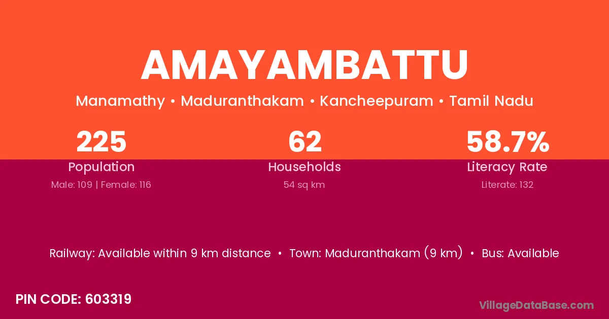 Maduranthakam (9 km) is the nearest town to Amayambattu village for major economic activities and is located approximately 9 km away.