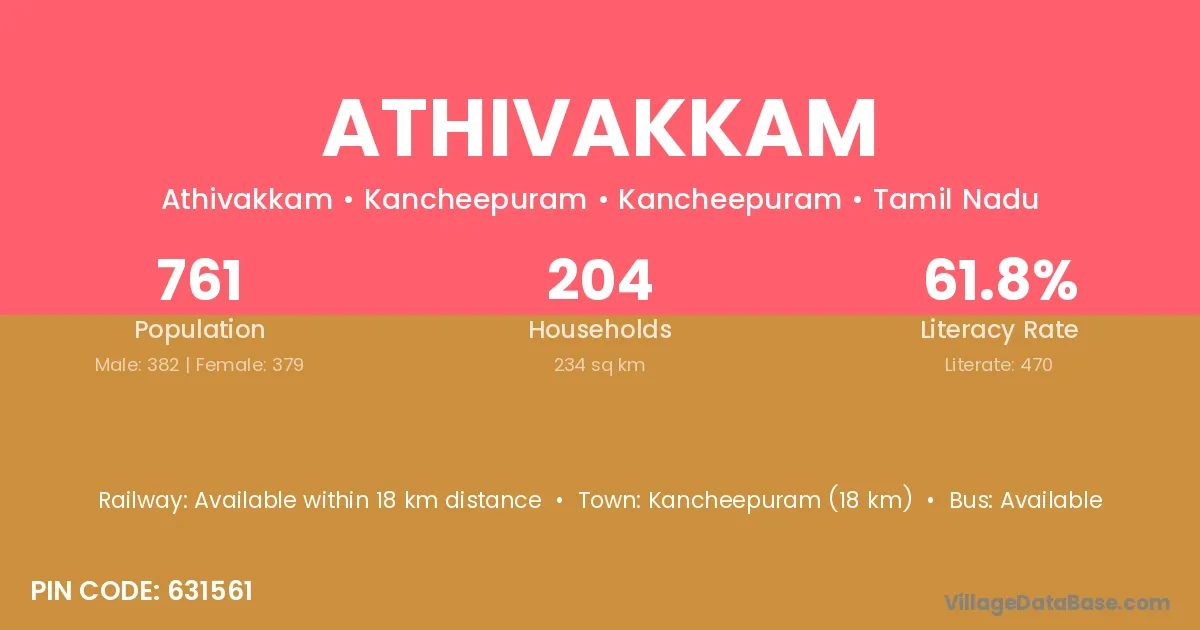 Maduranthakam (12 km) is the nearest town to Athivakkam village for major economic activities and is located approximately 12 km away.