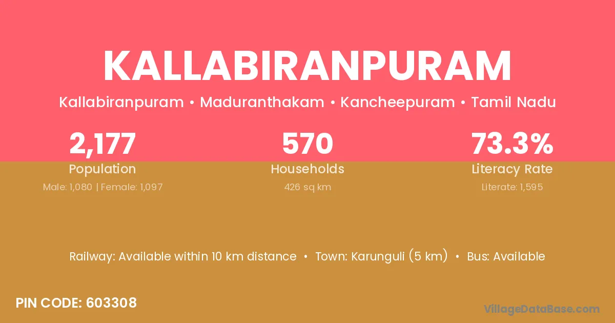 Karunguli (5 km) is the nearest town to Kallabiranpuram village for major economic activities and is located approximately 5 km away.