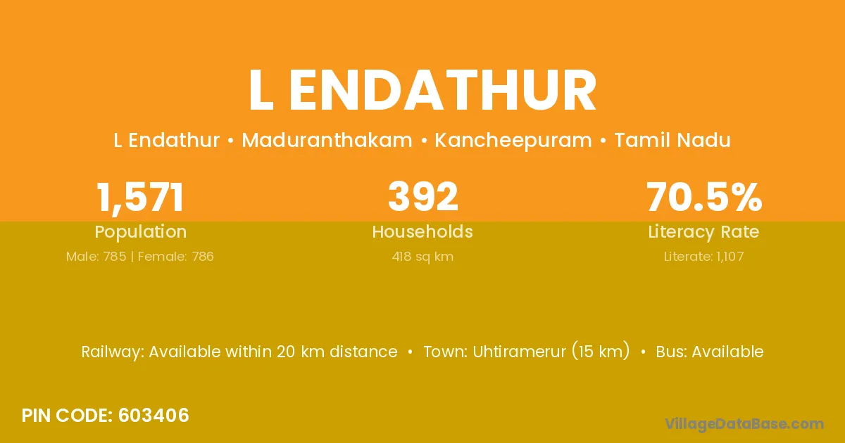 Uhtiramerur (15 km) is the nearest town to L Endathur village for major economic activities and is located approximately 15 km away.