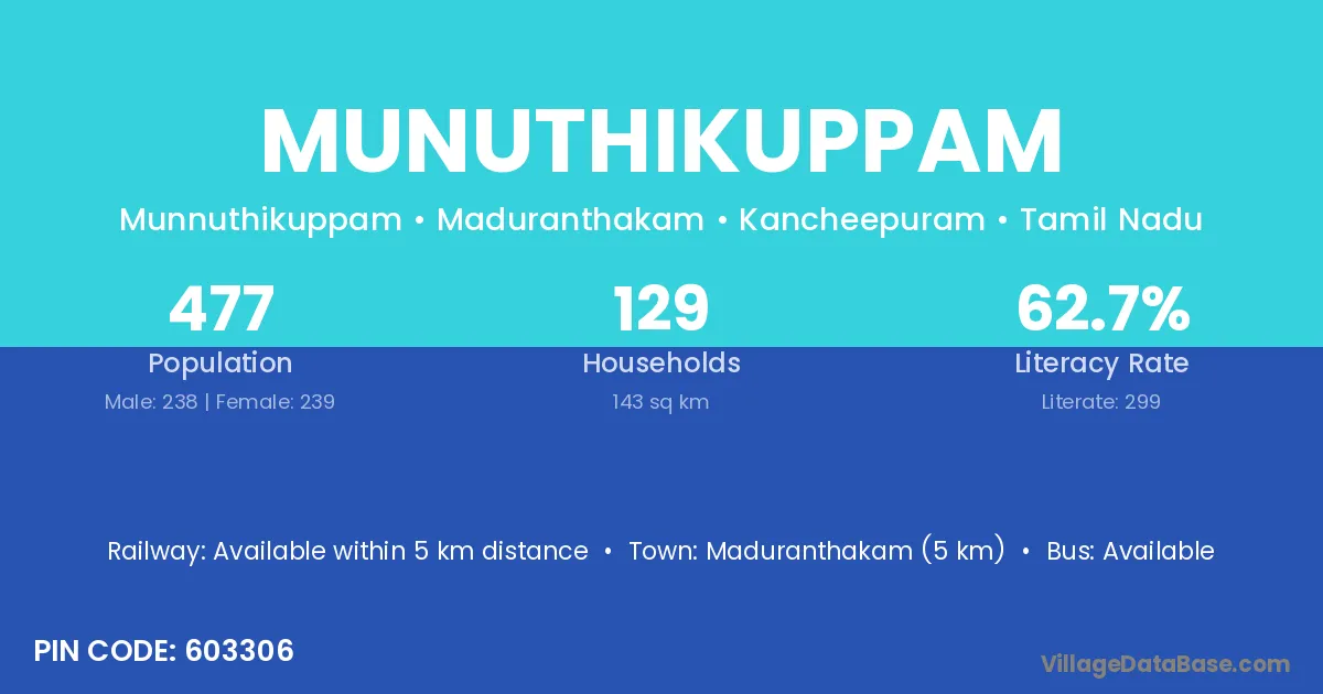 Munuthikuppam village has a total population of 477 people, of which 238 are males and 239 are females.