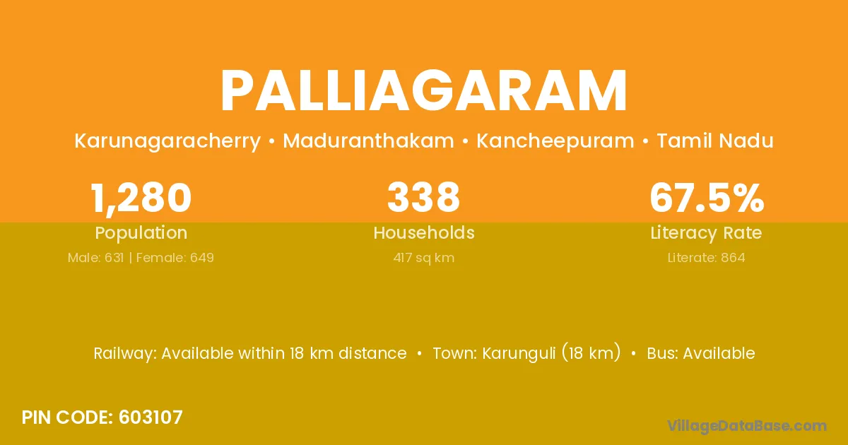 Karunguli (18 km) is the nearest town to Palliagaram village for major economic activities and is located approximately 18 km away.