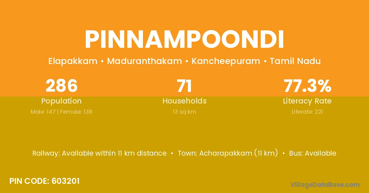 Acharapakkam (11 km) is the nearest town to Pinnampoondi village for major economic activities and is located approximately 11 km away.