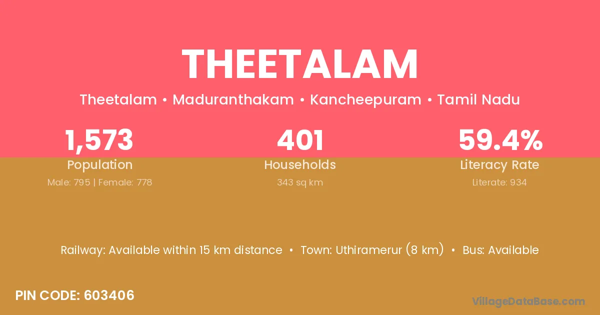 Theetalam village has a total population of 1,573 people, of which 795 are males and 778 are females.